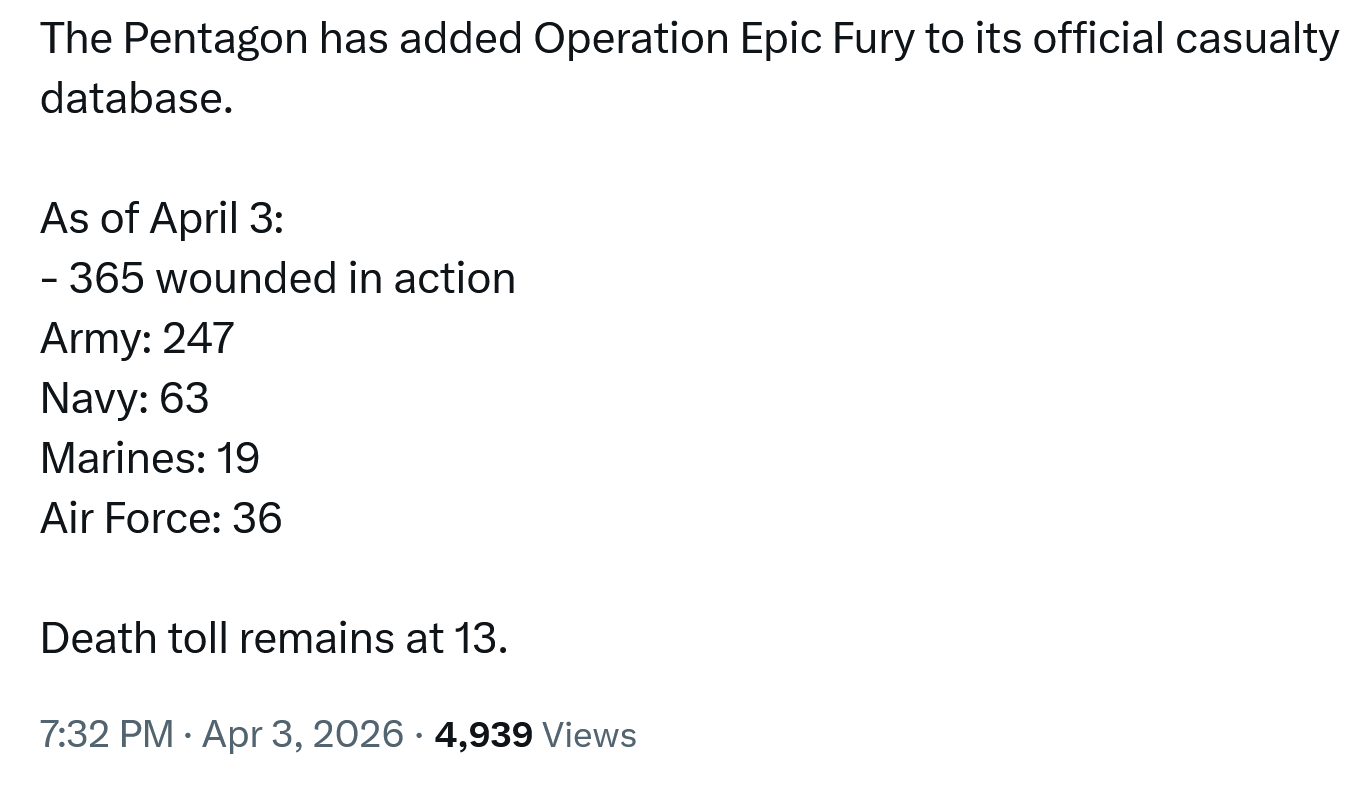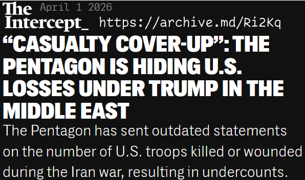 >>532209154"CASUALTY COVER-UP": THE PENTAGON IS HIDING US LOSSES UNDER TRUMP IN THE MIDDLE EASTThe Pentagon has sent outdated statements on the numer of U.S. troops killed or wounded during the Iran war, resulting in undercounts.>Almost 750 U.S. troops have been wounded or killed in the Middle East since October 2023, an analysis by The Intercept has found. But the Pentagon won’t acknowledge it.>CENTCOM has sent outdated statements on casualty numbers, meanwhile, resulting in undercounts, including a statement sent Monday from spokesperson Capt. Tim Hawkins noting that “Since the start of Operation Epic Fury, approximately 303 U.S. service members have been wounded.” The comment was three days old and excluded at least 15 wounded in the Friday attack on Prince Sultan Air Base in Saudi Arabia. The command did not reply to repeated requests for updated figures.>during the Biden administration, the Pentagon provided The Intercept with detailed chronologies of attacks on U.S. bases in the Middle East that listed the specific outpost that was attacked, the type of strike, and whether — or how many — casualties resulted, along with an aggregate count of attacks by country.>The Trump administration’s numbers, by comparison, lack detail and clarity. The current CENTCOM casualty figures do not appear to include more than 200 sailors treated for smoke inhalation or otherwise injured due to a fire that raged aboard the USS Gerald R. Ford before it limped off to Souda Bay, Greece, for repairs.> “U.S. soldiers fled military bases in GCC to hide in hotels and offices,” wrote Iranian Foreign Minister Araghchi on X last week. “Hotels in U.S. deny bookings to officers who may endanger customers. GCC hotels should do same.”>Gen. Votel also expressed concern about troops using hotels and offices, noting it “could turn normal civilian infrastructure into military targets for the regime.”https://archive.md/Ri2Kq