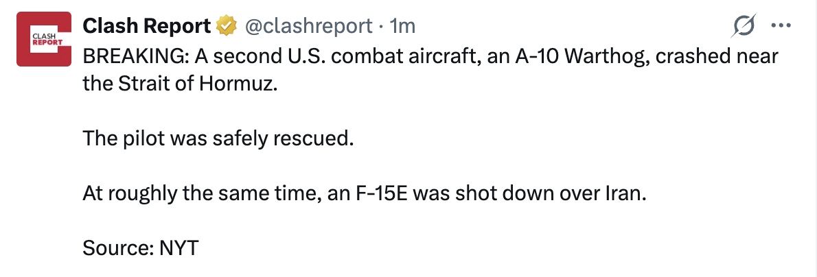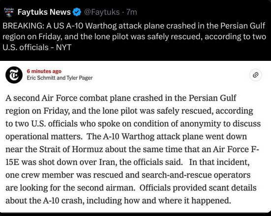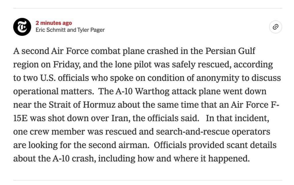 >New Second US Air Force combat plane crashes in Persian Gulf region on Friday, lone pilot rescued — NYT citing two US officials