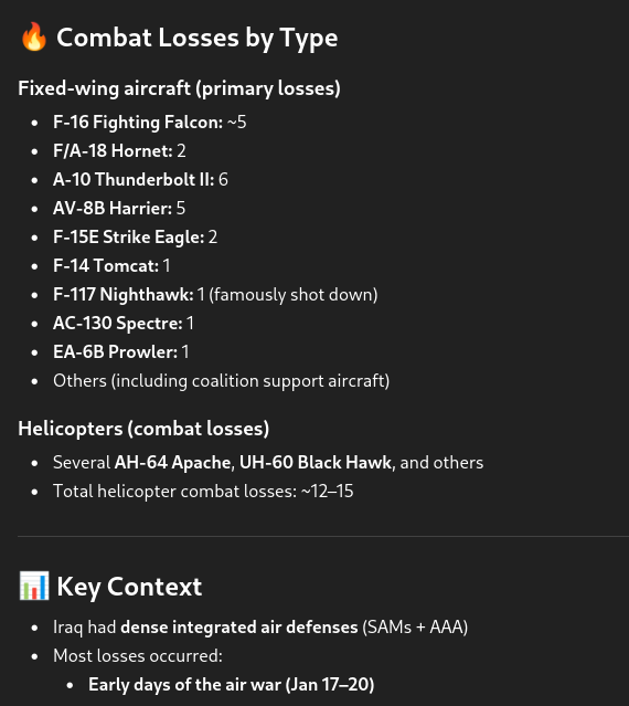 >>532300916Iraq faced the US air force head-on. This caused the US higher losses initially, but it also meant that Iraq's air force and AD suffered huge losses. That meant Iraq's strategy was not sustainable. Iran's AD, on the other hand, seems to be operating in ambush mode, picking off aircraft as opportunities arise. Iran can do this because Iran's military has built plenty of tunnels to hide in.Also, you have to count the 16+ MQ-9 drones lost as well as the untold number of Israeli and UAE drones lost in the Iran war.