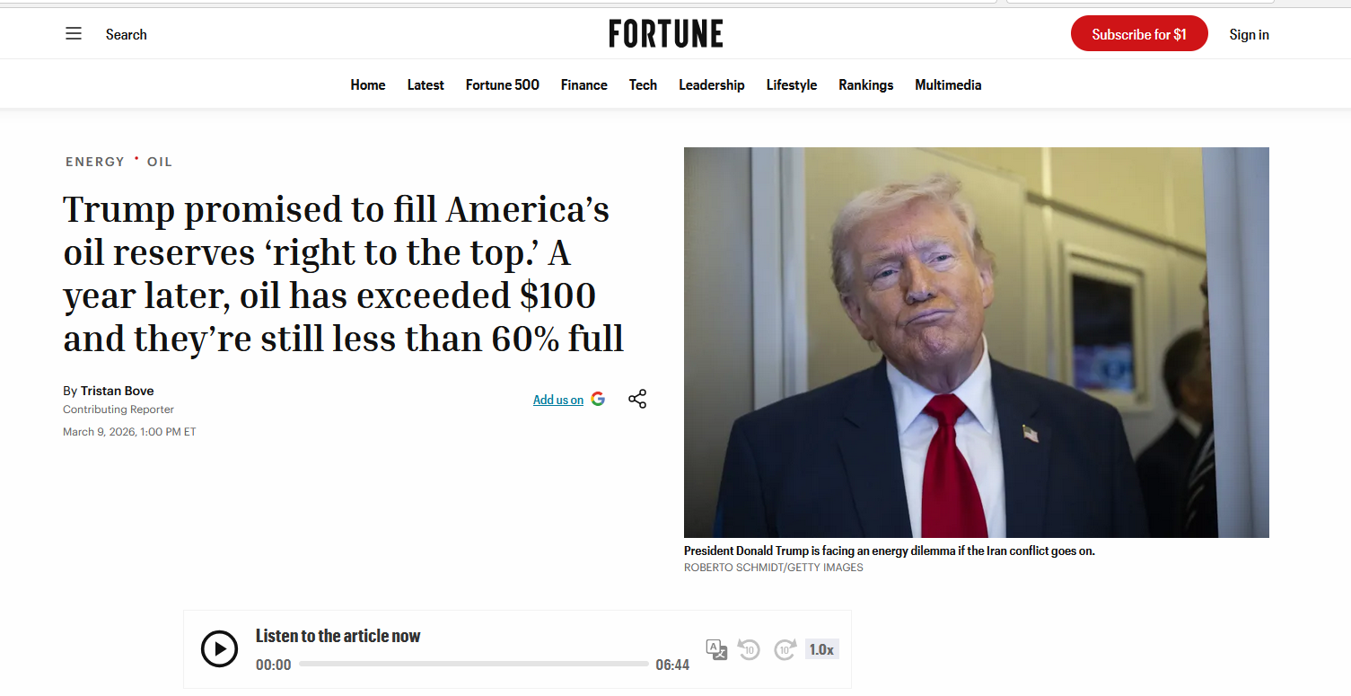 Trump promised to fill America’s oil reserves ‘right to the top.’ A year later, oil has exceeded $100 and they’re still less than 60% fullhttps://fortune.com/2026/03/09/us-oil-reserve-60-percent-full-despite-trump-pledge-to-refill/