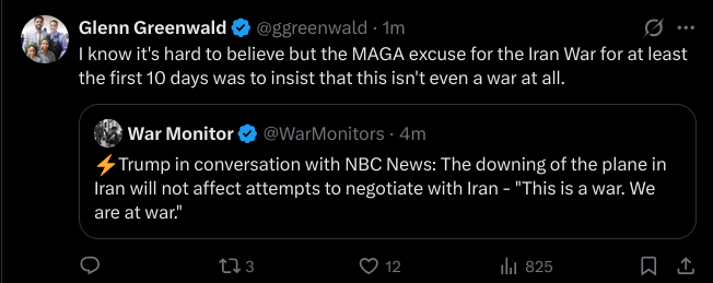 Jesus Christ, I take one day off and shit goes crazy.Just today we have Iran:Shot down:1x F-15E1x A-10Hit but escaped 1x F-15E 2x Blackhawks Possibly another A-10, but that could be the same one that went down Over Iraq:Hit:1x F-16CJ electronic warfare plane1x KC-135 stratotanker Additionally:A second KC-135 stratotanker flashing emergency while landing in Israel AA going off today across the board.And now there's another tanker burning in Hormuz. Hell of a day.