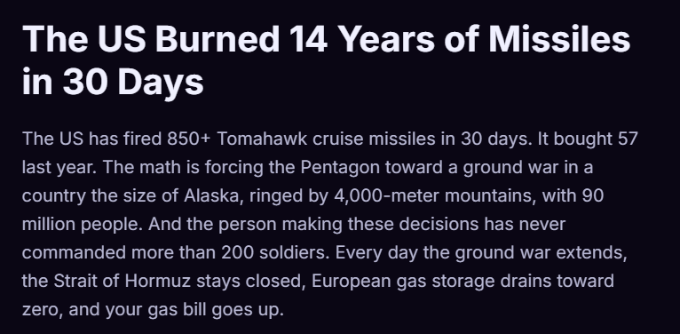 >>532306112Except when this war ends>Iran will have nukes>Iran will control the strait of Hormuz >Petro Dollar won't be used anymore>US kicked out of the middle eastThe Petrodollar pretty much means the end of the US as we know it. All that spending on the military and no Petrodollar means 10-30% inflation a year. Along with that ridiculous amount of debt we have to pay and interest every year. We are kinda fucked. Oh and we wasted a lot of munitions we have to rebuild so yeah we don't even have our priorities strait. I guarantee you that Bridge in Tehran will be rebuilt faster than the Baltimore bridge.