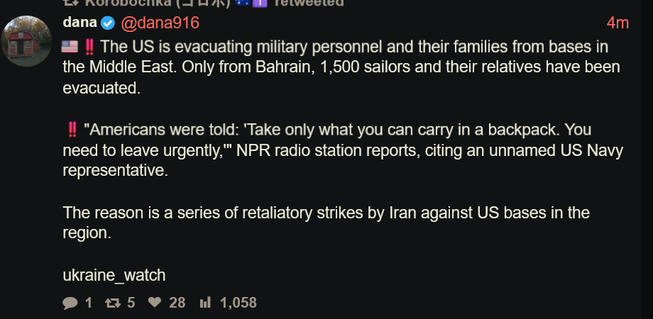 Previous >>532301637▶Pilot Easter egg hunt:>US special forces have rescued one>Other one still missing▶RECENT:>Multiple SQU-ACK 7700 alerts of stratotankers>An A-10 Warthog down>IRGC threatens to bomb the Stargate AI data center in Abu Dhabi>An American F-16 allegedly has been hit by Iranian AD over Iraq>US and Iran militaries competing on an Easter egg hunt to rescue or capture the downed US air force pilots>The IRGC claims it took down an F-15>Possible aerial interception and downing of American helicopter pilot by Iranian forces>French ship successfully crosses strait of hormuz>Hegseth is purging US generals, 14 generals fired so far>Habshan gas facilities in Abu Dhabi have temporarily suspended operations>Iran has struck a Kuwaiti power and desalination plant, causing damage, according to the Kuwait Ministry of Electricity>IRGC’s 15 Khordad garrison in Isfahan’s Baharestan area was targeted with missiles again in the early morning▶Day 34>France joins Russia and China in rejecting UNSC resolution authorising use of force to open Hormuz>Austria has denied any American operations over their airspace>US/Israeli airstrikes destroyed the B1 Bridge, which crosses Karaj river, northern Iran.>"Two to three more weeks until it's over" — Trump>NYT: "Iran is not currently willing to negotiate"▶Oilhttps://oilprice.com/oil-price-charts/>WTI $111>BRENT $109>DUBAI $128>Do not trust any "happenings" without link/proof▶Kinohttps://files.catbox.moe/20lpu8.mp4https://files.catbox.moe/jv7tdp.mp4▶Live-streams:https://www.youtube.com/watch?v=4E-iFtUM2kk https://www.youtube.com/watch?v=O13ynBspdus ▶Telegram channelshttps://rentry.org/tgnews▶Israel Rocket Alertshttps://www.tzevaadom.co.il/en/▶Air Traffichttps://www.flightradar24.com/https://flightaware.com/livehttps://globe.adsbexchange.com▶Maritime Traffichttps://www.marinetraffic.com/https://www.vesselfinder.com/▶Bread:https://rentry.org/PIGOP