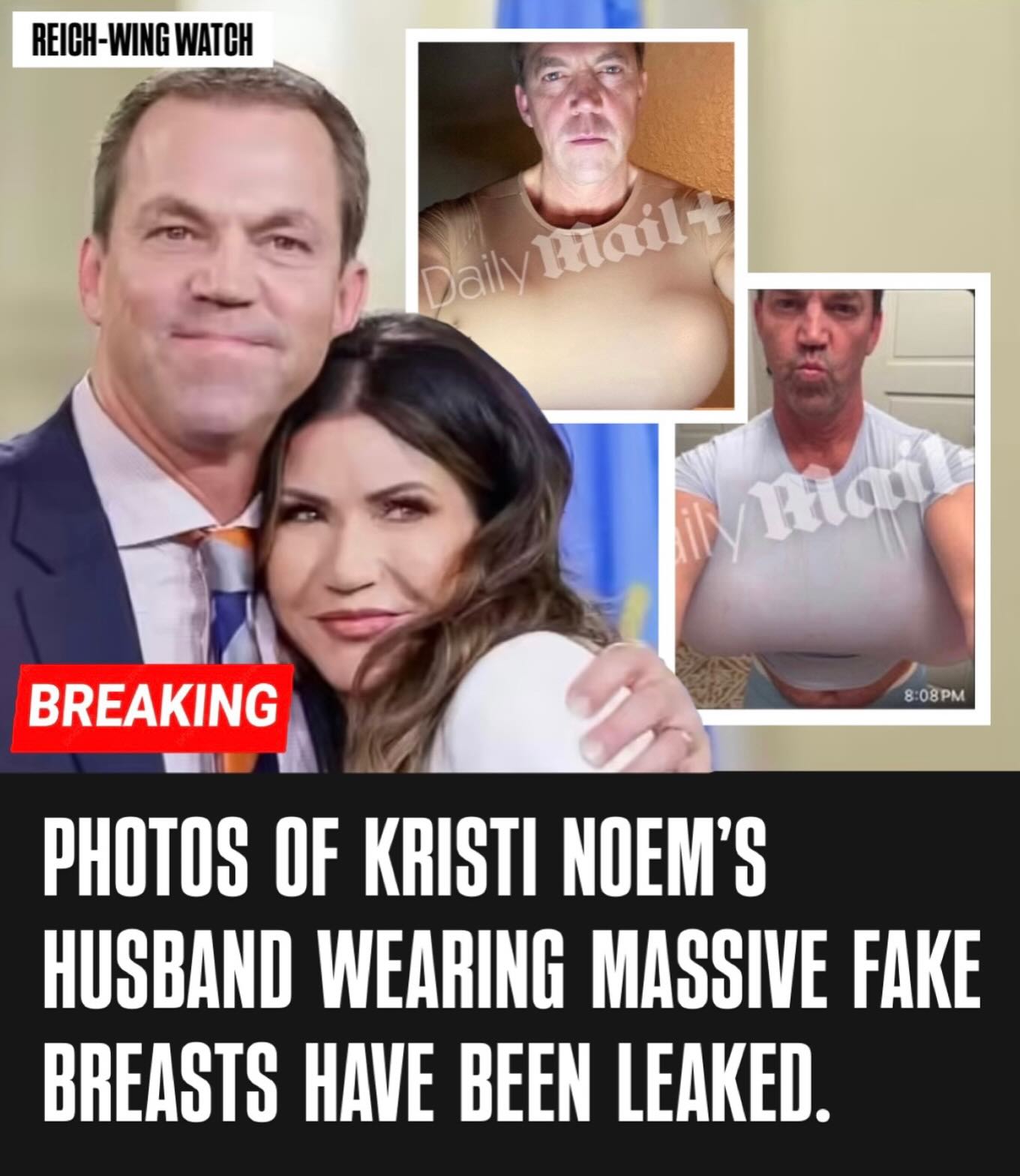 Kristi Noem once demanded a total ban on drag shows at South Dakota’s public universities, sneering that “these divisive theories shouldn’t be celebrated through public performances on taxpayer-owned property.” She raged against “gender theories” and “radical indoctrination” while pretending to champion free speech.Meanwhile: her husband Bryon Noem was secretly living his own crossdressing fantasy — dressing up in giant fake breasts made from balloons, pink hotpants, tight crop tops, and figure-hugging outfits to chat with online “bimbofication” fetish models. Photos from early 2025 show the 56-year-old pouting and posing, gushing over “huge, huge ridiculous boobs” and sending more than $25,000 via Cash App and PayPal under the name “Jason Jackson.”National security experts are warning this kink could open the door to blackmail by foreign spies — “astounding” bad judgment for the spouse of someone at the highest levels of government.Bryon admitted having a wife and family in the messages, saying things like “I love my wife, I want to get better,” before vanishing and resurfacing. When contacted, he didn’t deny the explicit chats or photos.Kristi’s team says she’s “devastated,” the family was “blindsided,” and they’re asking for privacy and prayers. Funny how the self-appointed guardians of “family values” and anti-drag crusaders always seem to have skeletons (or should we say sequins?) in their own closets. The right loves lecturing everyone on morality… until the spotlight hits home. Classic GOP projection!