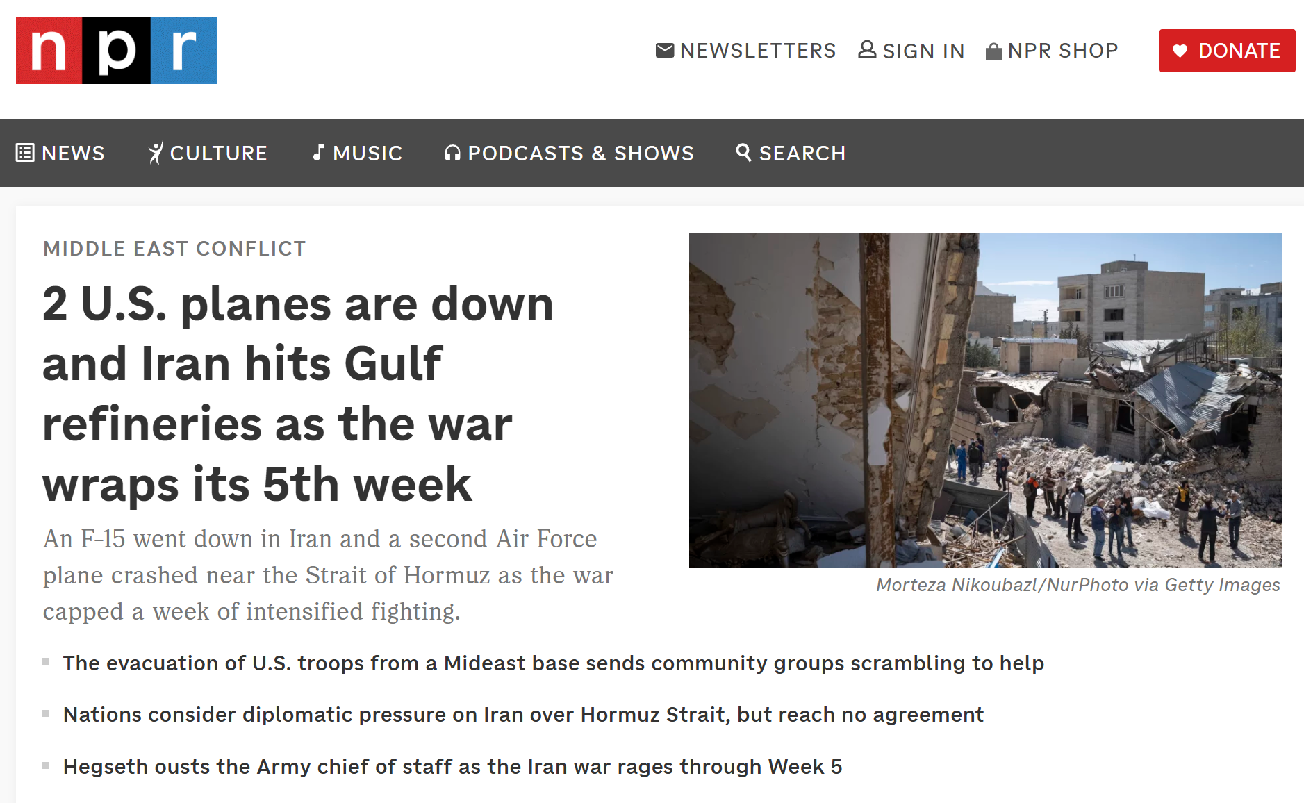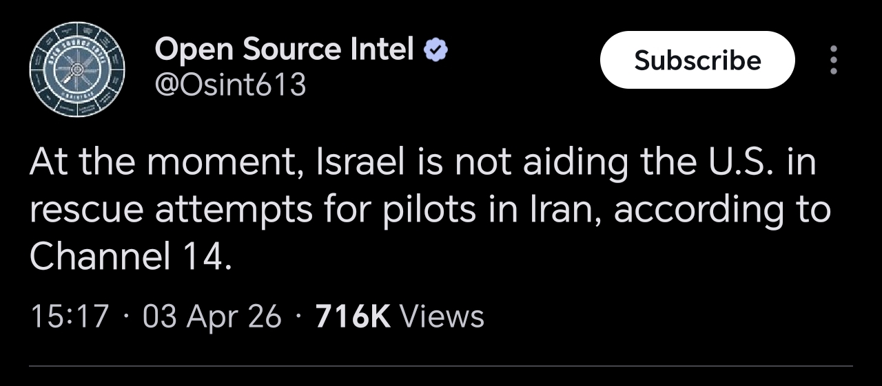 >>532307376▶Pilot Easter egg hunt:>US special forces have rescued one>Other one still missing▶RECENT:>Multiple SQU-ACK 7700 alerts of stratotankers>An A-10 Warthog down>IRGC threatens to bomb the Stargate AI data center in Abu Dhabi>An American F-16 allegedly has been hit by Iranian AD over Iraq>US and Iran militaries competing on an Easter egg hunt to rescue or capture the downed US air force pilots>The IRGC claims it took down an F-15>Possible aerial interception and downing of American helicopter pilot by Iranian forces>French ship successfully crosses strait of hormuz>Hegseth is purging US generals, 14 generals fired so far>Habshan gas facilities in Abu Dhabi have temporarily suspended operations>Iran has struck a Kuwaiti power and desalination plant, causing damage, according to the Kuwait Ministry of Electricity>IRGC’s 15 Khordad garrison in Isfahan’s Baharestan area was targeted with missiles again in the early morning▶Day 34>France joins Russia and China in rejecting UNSC resolution authorising use of force to open Hormuz>Austria has denied any American operations over their airspace>US/Israeli airstrikes destroyed the B1 Bridge, which crosses Karaj river, northern Iran.>"Two to three more weeks until it's over" — Trump>NYT: "Iran is not currently willing to negotiate"▶Oilhttps://oilprice.com/oil-price-charts/>WTI $111>BRENT $109>DUBAI $128>Do not trust any "happenings" without link/proof▶Kinohttps://files.catbox.moe/20lpu8.mp4https://files.catbox.moe/jv7tdp.mp4▶Live-streams:https://www.youtube.com/watch?v=4E-iFtUM2kk https://www.youtube.com/watch?v=O13ynBspdus ▶Telegram channelshttps://rentry.org/tgnews▶Israel Rocket Alertshttps://www.tzevaadom.co.il/en/▶Air Traffichttps://www.flightradar24.com/https://flightaware.com/livehttps://globe.adsbexchange.com▶Maritime Traffichttps://www.marinetraffic.com/https://www.vesselfinder.com/▶Bread:https://rentry.org/PIGOP