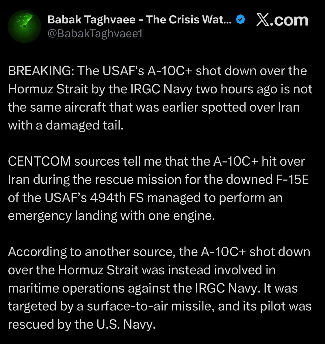 >>532310361>>No other plane was shot down today, just an A-10 suffering superficial damageUS officials already confirmed that it went down in the Persian Gulf. Ask for a new script Shitvinder