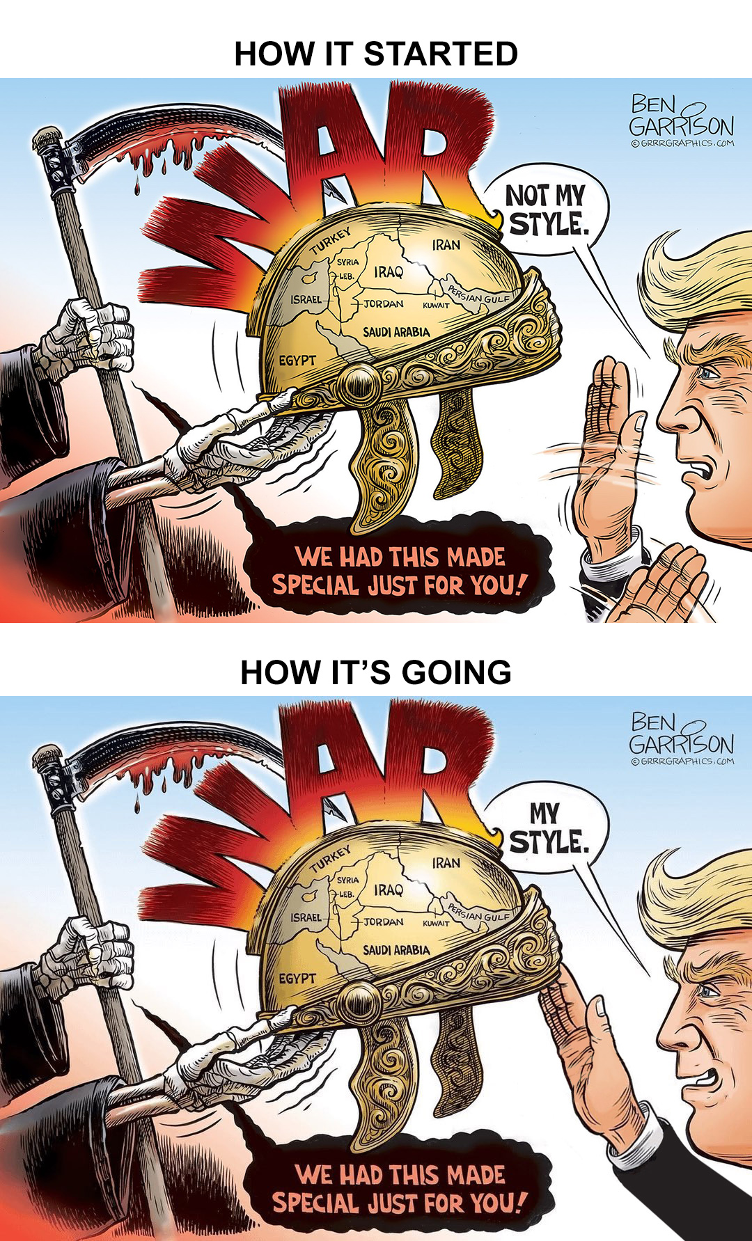 Pretty Ben has some old comics praising Trump for avoiding war and blaming Democrats for Iraq and Afghanistan and so on. It's not a cult, though.