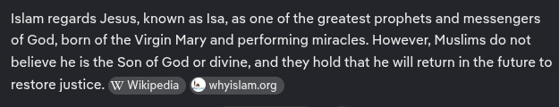 >>532316931>classic Divide and Conquer straight from the talmudThe only disagreement point islam has with christianity is about him being the son of god and not his prophet. Everything else is on point.In fact they expect him to return and lead both muslims and christians against the jewish false messiah.You know what the jews say about christ, though?