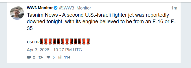 Tasnim News - A second U.S.-Israeli fighter jet was reportedly downed tonight, with its engine believed to be from an F-16 or F-35https://nitter.catsarch.com/WW3_Monitor/status/2040194499574382949#m