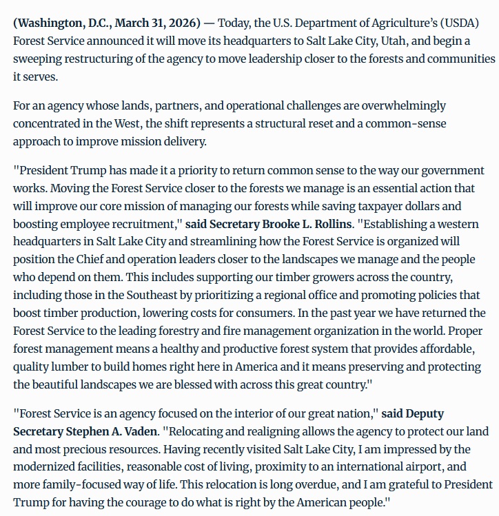 it's over>Trump administration announced the most devastating attack on the U.S. Forest Service in the agency’s 121-year history. Not a budget cut. Not a policy shift. Not a “reorganization.” An execution.>One hundred and ninety-three million acres of your national forests. An area larger than Texas. The largest public land agency in the country. Just handed, on a silver platter, to the people who’ve spent their entire careers trying to destroy it.https://www.thewildlifenews.com/2026/04/02/breaking-trump-administration-orders-dismantling-of-the-u-s-forest-service/