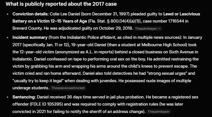 >>532319270>You invented those numbers in your head, didnt you?From his sex offender registry page in Florida.His date of conviction is before his 20th birthday, he could of been 18 when charged.And the crime statute range is specified as 12-15, but he wasn't sentenced to prison, or jail, he was just given supervision and register as a sex offender.That will tell you its probably something that he shouldn't of even been on the registry for, but its procedure.If he was 19 with a 12-13 year old they would of given him prison time for sure.