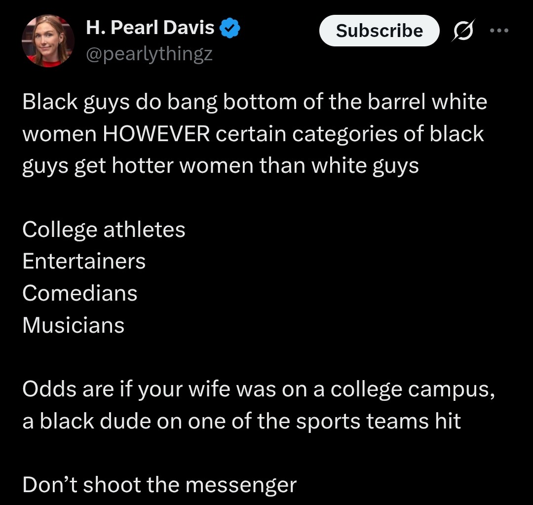 >>532318543Pearl only dates niggers. All of her BF have only been niggers. She's never dated a single non-nigger in her life. She will never get married or build a family. Pearl's only value is that she make foids seethe even though she's just like them.