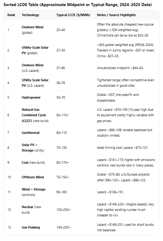 >>532327097Global wind capacity exceeded 1,200 GW by mid-2025, with record additions continuing (over 117 GW in 2024 alone, led by China). Onshore wind LCOE in good-to-average sites now sits around $30–60/MWh (often $25–50/MWh in optimal areas like parts of China, the US plains, or Europe), making new onshore wind one of the cheapest forms of new electricity generation — competitive with or cheaper than new coal or gas in most markets,