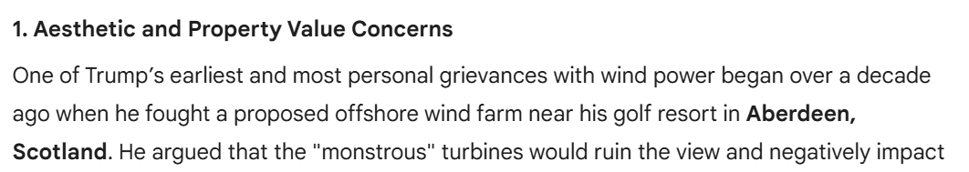 I read an article on this, he especially hates wind turbines because he had an issue with them in Scotland where they ruined his Golf Court with them, I don't exactly remember - ever since then he will rant against wind power and windmills every once in a while, he repeats rather often that they look ugly and he doesn't like them