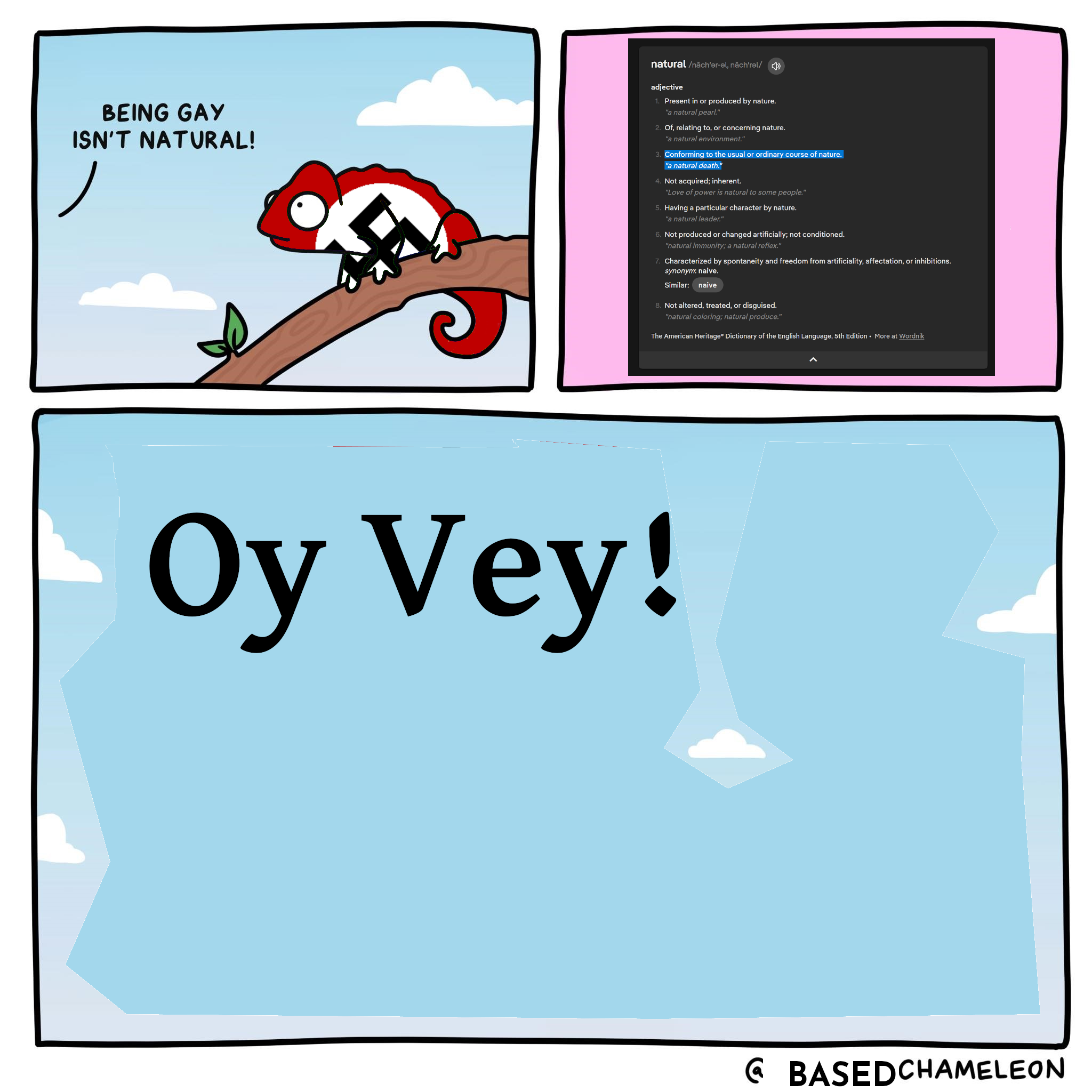 >>532323386Natural can be used as synonym for normative and very clearly in the context of some politically oriented guy talking about homosexual behavior he's meaning normative/typical/expected-behavior. The faggot that made the OP comic made a categorical error. Many words have different meanings depending on contexts. e.g logos in philosophy, theology, and psychology means 3 different things.The psychological definition of logos often refers to the masculine principle of rationality, contrasting with the feminine principle of eros, while the philosophical definition emphasizes logos as a principle of order and reason in the universe, originating from ancient Greek thought. In contrast, the theological definition identifies logos with the divine Word, particularly in Christianity, where it is associated with Jesus Christ as the embodiment of God's revelation.An irrational idiot who isn't well schooled in formal logic might ignore context and start talking to you about the logos of psychology or theology when you were talking about the logos of philosophy. One of most common errors of pseudointellectuals like Juden Peterstein is the categorical error, although that faggot makes a TON of other errors besides.Nobody saying "being gay isn't natural" means it isn't found in nature, they just mean it's not typical, it's normative behaviour, it's queer, it's strange, it's odd, it's atypical, etc. various ways of saying it isn't the default/common way of being.