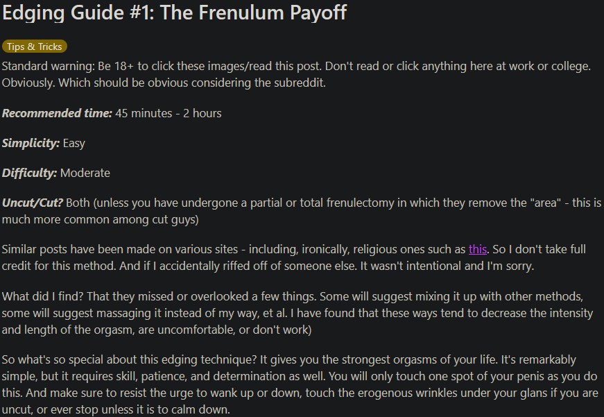 I almost never do this, but for these fringe topics I feel like there is no harm: This is an absolute masterclass in subversion for whichever Jew allowed this to be published.1.) The framing reinforces a core tenant of feminism: Sex is for pleasure. They even managed to use “G-Spot” term to describe something that is physiologically not-analogous-at-all with the actual G-Spot. End result:2.) (You) look gay as shit. The picture even reinforces this. Man laying on his back moaning.3.) Real world impact: Since we have established that (1) is the core message, the core framing, namely the upholding of “sex-for-pleasure” philosophy, we can now apply un-cut dicks and run the simulation. Result: Females seeking pleasure will choose circumcised penis. This is not in itself good or bad. However, if (1) is maintained, if the feminist framing of sex persists, (You) have now found yourself in a serious predicament.Extremely potent subversion.