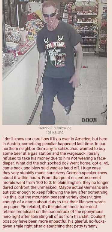 >>532330266>>532330593german chad walked into a convenience store to buy something, vaxxie screeched at him for not wearing a mask. He shot & killed the vaxxie and then "lockdowns" (mass home arrest & imprisonment) and bullshit ended in germany.
