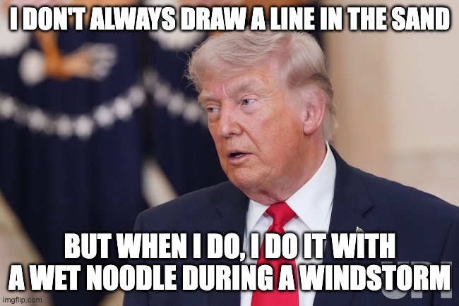 Mar 13: “We won the war.”Mar 14: “Please help us.”Mar 15: “If you don’t help us, I will certainly remember it.”Mar 16: “Actually, we don’t need any help at all.”Mar 16: “I was just testing to see who’s listening to me.”Mar 16: “If NATO doesn’t help, they will suffer something very bad.”Mar 17: “We neither need nor want NATO’s help.”Mar 17: “I don’t need Congressional approval to withdraw from NATO.”Mar 18: “Our allies must cooperate in reopening the Strait of Hormuz.”Mar 19: “US allies need to get a grip – step up and help open the Strait of Hormuz.”Mar 20: “NATO are cowards.”Mar 20: “At a certain point, the Strait of Hormuz will open itself.”Mar 21: “Allies must open the Strait of Hormuz. We don’t use it, we don’t need to open it.”Mar 22: “This is the last time. I will give Iran 48 hours. Open the strait.”Mar 22: “Iran is Dead now.”Mar 23: “Having productive talks with Iran; postponing energy grid attacks for 5 days.”Mar 23: “I cannot tell you who we are negotiating with in Iran because Israel will kill them.”
