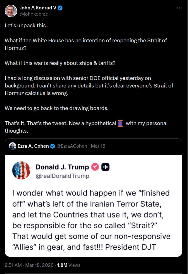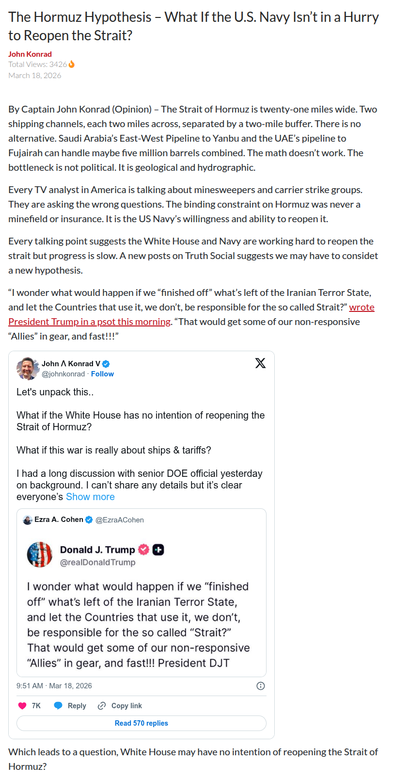 >>532336548The Maritime Dream Team That WasTo understand why this matters, you need to understand what Trump built and what was destroyed.Trump came into his second term determined to restore American maritime power. He assembled the greatest collection of maritime minds in key government positions since Nixon. He put Mike Waltz, creator of the SHIPS for America Act, as head of the National Security Council. He created a Maritime Office in the White House. He appointed maritime advocates to key positions throughout the administration. He signed a sweeping Maritime Executive Order in April 2025 directing a Maritime Action Plan across Defense, State, Transportation, and Homeland Security.He started targeting chokepoints: Panama, the Red Sea, Suez, the Greenland-UK Gap. He launched investigations into Gibraltar and Spain. He created USTR actions to tariff Chinese-built and operated ships. He called CMA CGM’s CEO Rodolphe Saadé to the Oval Office and secured a $20 billion commitment to American maritime investment.The ambition was real.So was the pushback.Interesting Readhttps://gcaptain.com/the-hormuz-hypothesis-what-if-the-u-s-navy-isnt-in-a-hurry-to-reopen-the-strait/2 of 2