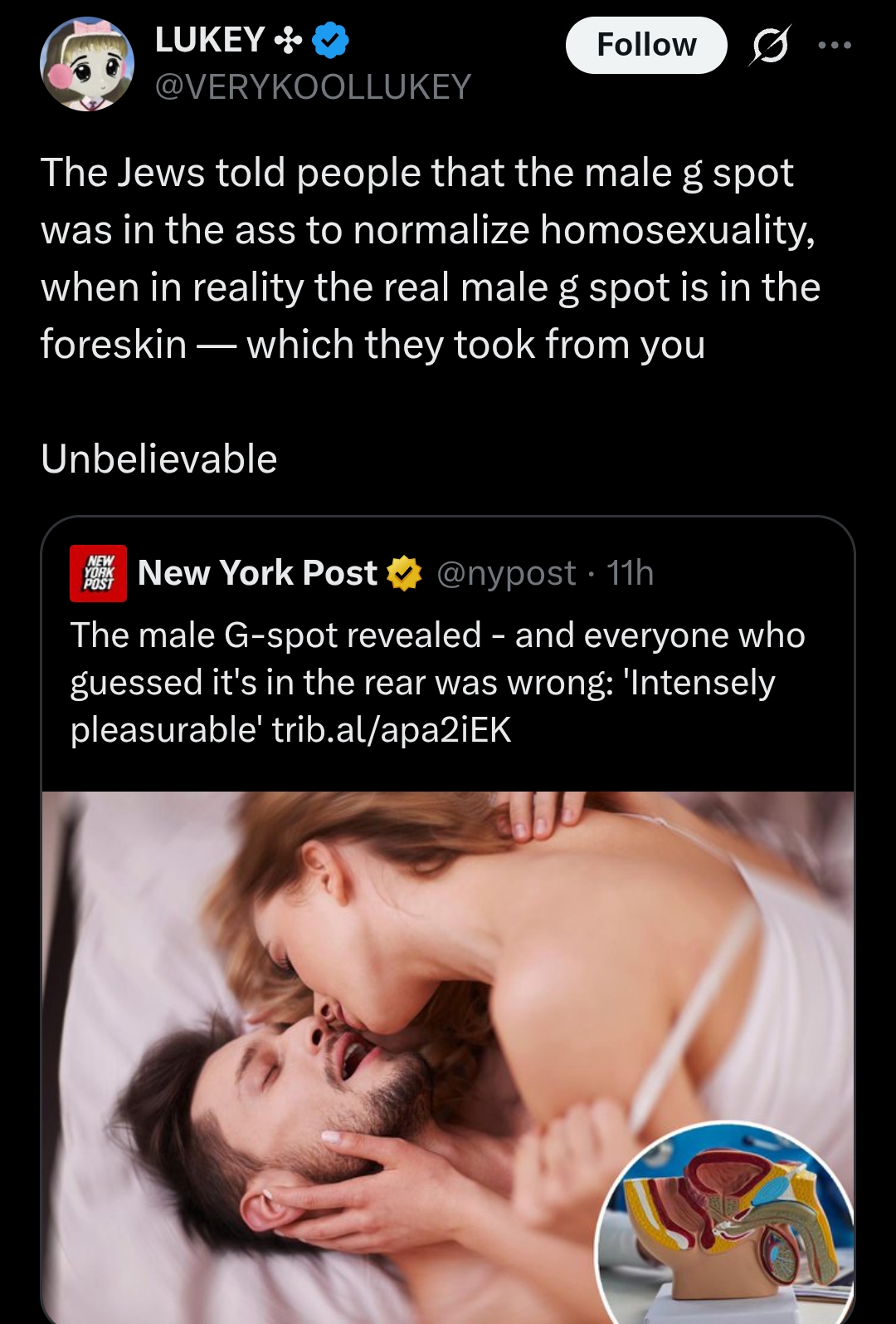>1pbtIDjeet postcircumcision should be outlawed and kikes should be gassedbut you can't deny anatomy. the prostate is an orgasm-button.