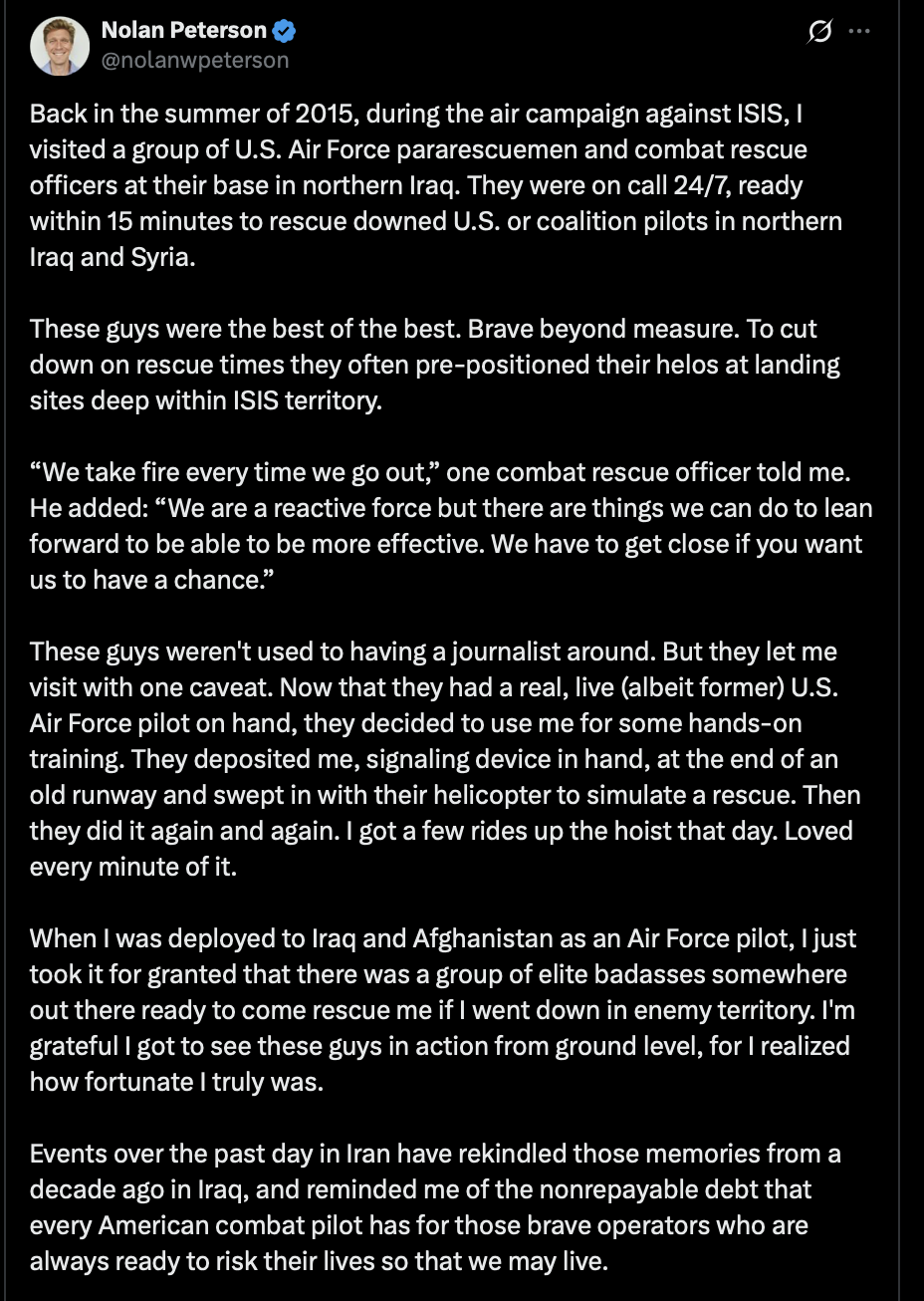 The sun is up over Tehran and it's still getting rocked by bomb after bomb after bomb. I'm concerned, though, that there has been no update on the downed F-15 crewman.