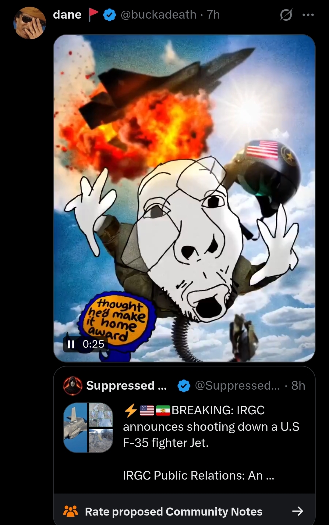 >US aviation's black day:>F-15E downed; 1 crew missing.>2 HH-60Ws hit by Iran fire.>A-10 crashed in Persian Gulf; pilot saved.>2nd A-10 hit; emergency landed w/ 1 engine.>F-16 had emergency over Iraq; landed.>KC-135 had emergency over Israel; landed.