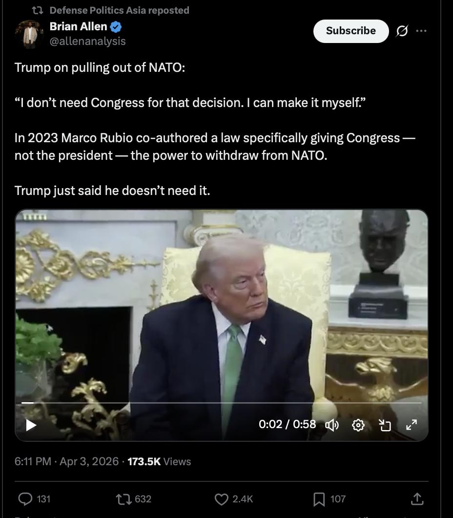 >>532336885POTUS can withdraw from a treaty without the consent of Congress. Goldwater v. Carter affirmed this. >>532336972Yes!