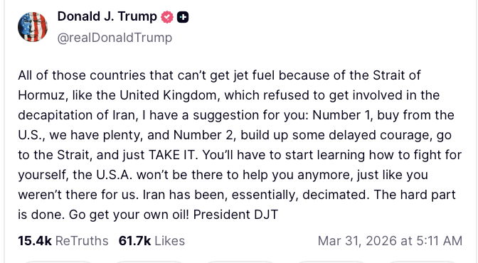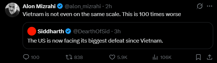 In four weeks of Trump's "special 24-hour op" to overthrow Iran:>Allowed Israel to cuck him in to a war (per Rubio)>Uses it as a convenient way to avoid his pedophilia in the Epstein files>15 *confirmed* dead Americans, over 290 wounded>Unknown numbers of Americans captured>Trump says dead Americans "Is the way it is" and "there will be more">US commander tells troops Trump was 'chosen by Jesus to unleash Iran Armageddon'>Every US base in the Middle East destroyed by Iran's airstrikes>Order the strike that murdered over 150 Iranian schoolgirls>US fighter jets destroyed>US reaper drones destroyed>US THAAD missiles exhausted>Recession>Allows transgendering children>Begs NATO to get involved>Strait of Hormuz closed>US gas prices skyrocketing>US refuelling plane destroyed, more casualties>Trump confirms the war is for gays "We support gays, but they throw gays off the buildings. We have to wipe out the evil">US F-35 destroyed>Deportations under Trump average 900 a day (300,000 a year), Obama deported 3.2 million>US national debt doubles under Trump, $39 trillion>Joe Kent resigns, refuses to be involved in an Israeli war>Trump cucks out and lifts sanctions on Iran oil>US Embassy in Baghdad abandoned>At least 16 US military aircraft destroyed, per Bloomberg >US troop morale rock bottom: "We do not want to die for Israel", per Huffpost>Dementia Trump pretending he's negotiating with Iran, Iran denies any talks>Blatant evidence of Trump insider trading>US Patriot missiles destroy 3 US F-15s, friendly fire>US F-18 destroyed>Trump approval rating lowest of any president ever>Stock market loses over $1 trillion>US F-16 destroyed>Trump pulling back ICE agents massively>US F-15 destroyed, pilots captured>US Blackhawk destroyed>Two US A-10s destroyed>Highest number of USAF aircraft shot down within 24 hours since Vietnam>US F-16 destroyed>Four more weeks, goyim!