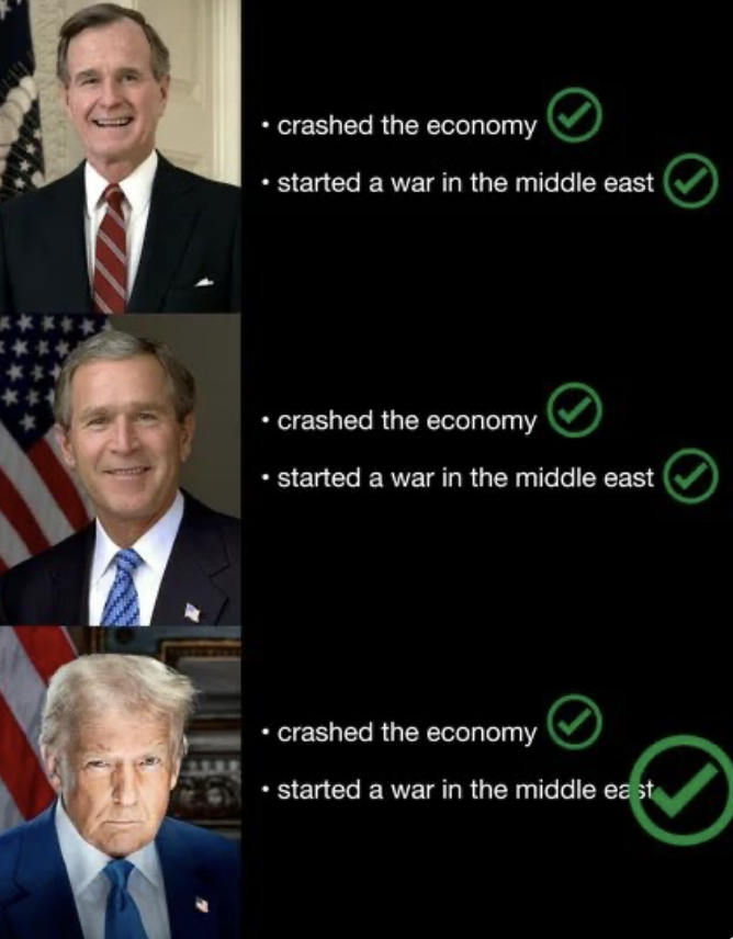 >>532336668To be fair, if you had Clinton, Obama and Biden it’s be similarClinton:- Crashed the economy- Started a War in Middle EastObama:- Crashed the economy- Started a war in RussiaBiden:- Crashed the economy- Started a war in Russia- Lost a war in the middle east