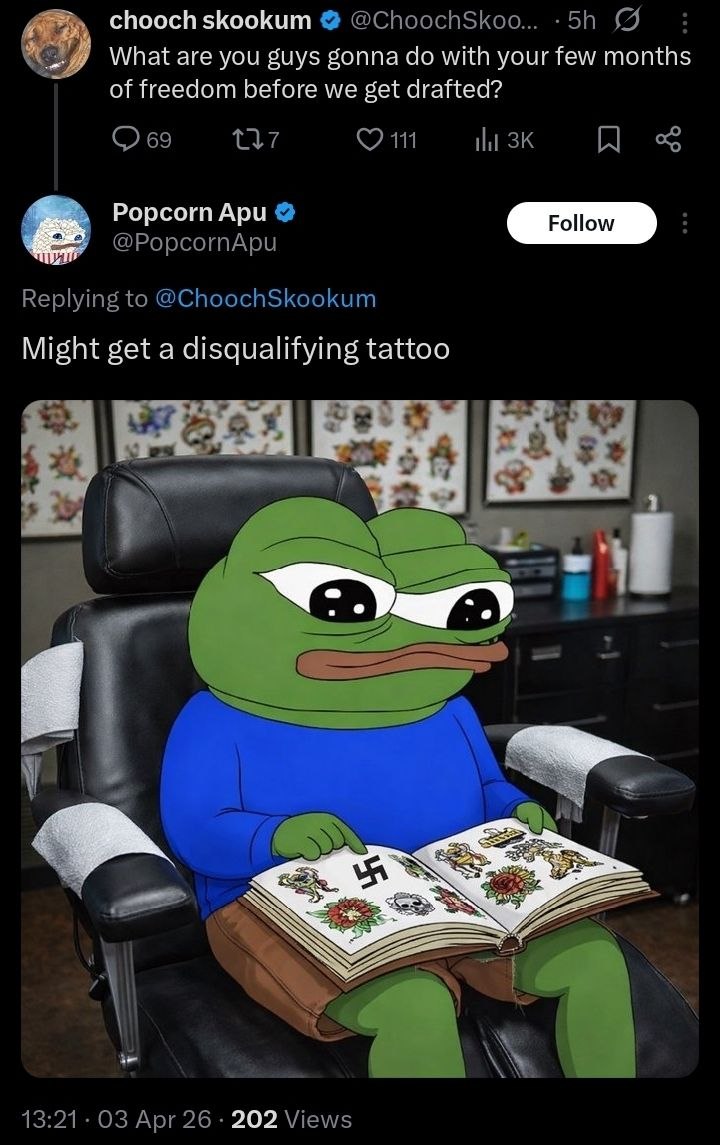 >>532337649Nothing. I'm not going. My brother is a doctor who would get me an exemption if needed. Worst case scenario, if they force me, I'll shoot the officer as soon as I get a gun and go AWOL. Because I'll know by then what they're trying to accomplish. They can send all the beaners and jeets. I'll keep their women warm while they're gone. Something you need to understand is that if they start drafting White men, they're just going to kill you. The woke shit is backfiring and they need to get rid of Whites faster. Minority birthrates are crashing and people are becoming more and more against immigration. So they'll start wars and just send you to die. No White men = no Whites. So you're better off fragging your CO and taking your chances. Even if you manage to survive battle, they'll have Sgt Tyrone shoot you in the back once you return to base. You're condemned to die either way. So make sure you fight.