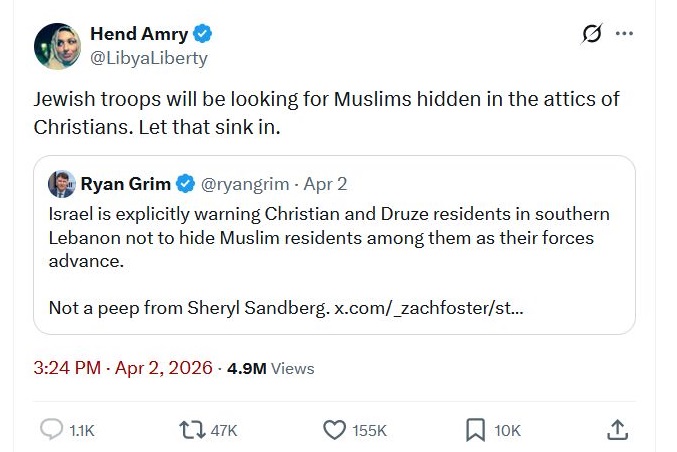>Israel is explicitly warning Christian and Druze residents in southern Lebanon not to hide Muslim residents among them as their forces advance. https://x.com/LibyaLiberty/status/2039695385464017281