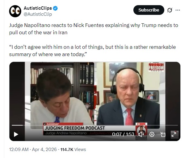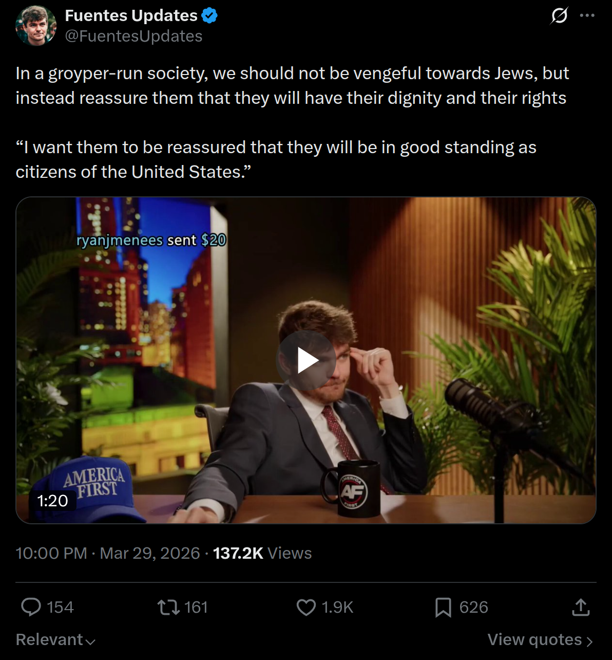 >>532341705Nick Fuentes got the full force of the Jewish mafia against him to crush his political career, but despite just being 18 years old, with no rich or influential family to support him, he managed to survive and is now one of the most influential political commentator in the US, and thus pretty much the world. Whatever you say about him, that's impressive. https://x.com/AutisticClip/status/2040190016391913711