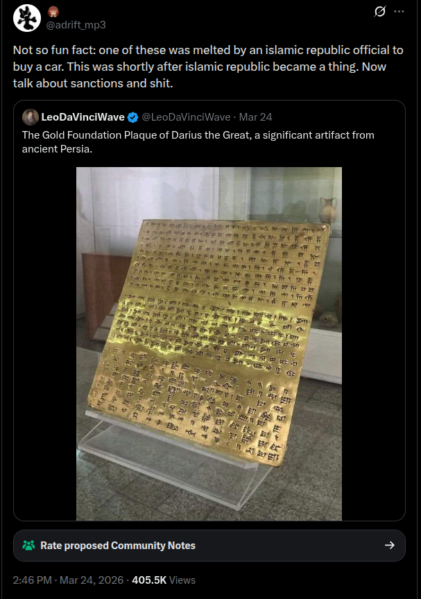 Literally this, the Muslims in charge of Iran have no respect for their ancient Persian history. Back in the 80s, one of the high level Iranian Muslims literally melted down a scroll of Darius the Great, in gold, from thousands of years ago, to buy an Iranian made car called a Paykan.
