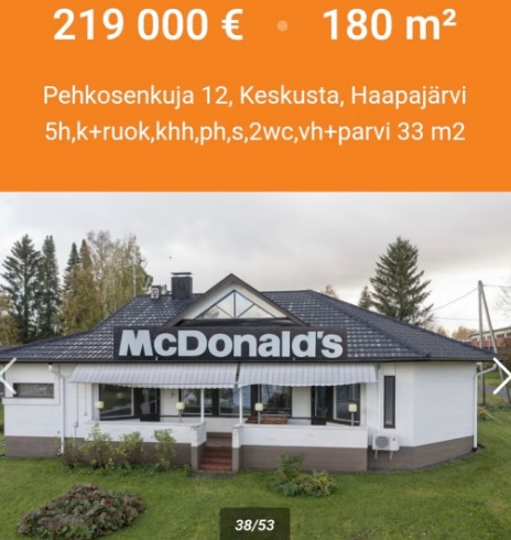 an old mcdonalds in north Finland was turned into a big detached home for one familythen the family moved outnow its for sale (for any use you might think for it since then you own it)nobody ever removed the mcdonalds sign