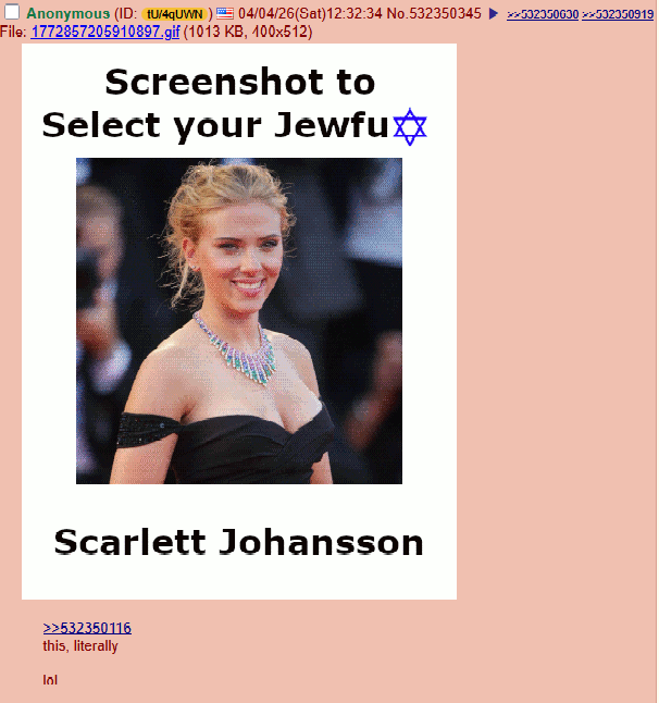 >>532350345Not bad.I hope she doesn't live up to her black widow title.>>532350919I had no idea she was a kike.Anakin fell to evil because of a kike?How fitting...