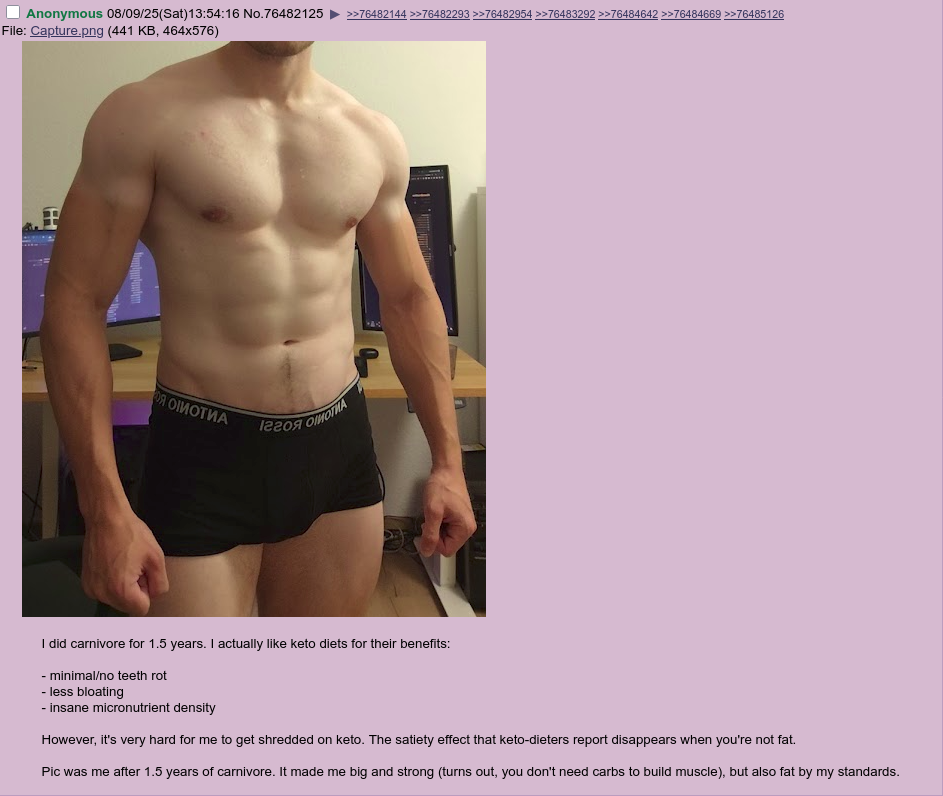 >>532351049It's not shilling really.Some people don't have the appropriate enzymes for baked carbs. I say some, it's quite a lot of people. All bloodgroup O people.Carbs are shit for their health, especially sugars. It's too sour and they don't break the sugar down fast enough to offset that.I'm type O and never had a sugar rush.Meat however, as long as it's not too much in one go, directly gives me energy because I have the enzymes to do that.My stool improved and became consistent when I cut out all the wheat. I still consume +85% chocolate but the bloat is minimised, it's minned instead of maxxed.Point being, everyone's got different dietary needs.A baseline ratio of 4:2:0,01 fat:protein:carb works for many but tinkering with it gets you where you need to be.
