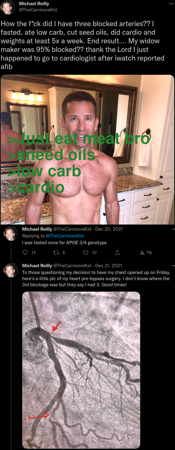 >>532374492LDL and Cholesterol are more effected by blood sugar and other foodsAnimal fats don't equal body fat>>532374057>Didn't the bf get so sick he almost died off it and then others started chanting death to her grift?He didnt almost die, going on a diet of just meat when you're a processed carb & sugar addled goyslop enjoyer is going to be PAINFUL - causing severe electrolyte imbalance, cramps, sicknesss ("Keto Flu"), and the BF probably has lactose intolerance (Dairy) of varying severity, esp. if he's hispanic/asian like she looks.Your body has to adapt and it reacts violently to you taking away processed garbage and easy energy carbs