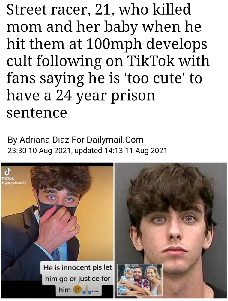 >>532353452>18-year-old Cameron Herrin and 17-year-old John Barrineau had been racing each other on Bayshore Boulevard when Herrin's vehicle collided with two pedestrians who were crossing towards West Knights Avenue. 24-year-old Jessica Raubenolt died at the scene and her 21-month-old daughter Lillia Raubenolt died in the hospital the following day.>The Mustang's black box revealed that he had been driving at 102 miles per hour in the moments preceding the crash despite a posted speed limit of 40 mph.>Prosecutors presented evidence that Cameron Herrin had a history of driving at reckless speeds, including once when he reached a speed of 162 mph on I-75. kys op