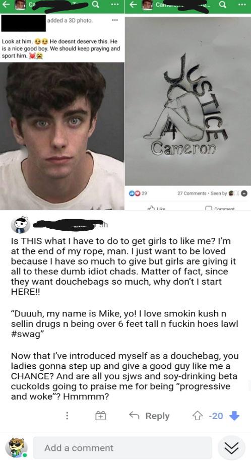 >>532353689OP is a middle eastern teenage foid, they've been endlessly pleading to have cameron released because they fell in love with him through tiktok tribute videos.