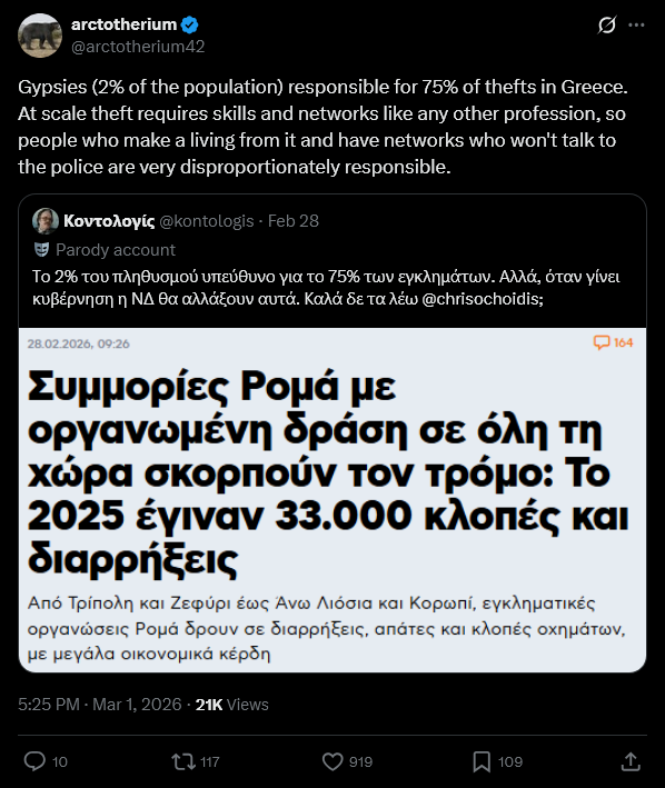 >>532378003According to Karakachanov, I remember reading it online on some news site.According to him, gypsies commit over 60% of regular crimer, 80% of all assaults and home break ins and on over 90% reported rapes(mostly on gypsy women). Remember, this is just reported stuff.Why aren't these statistic published, when he was asked? Because its illegal according to EU law because it could sow ethnic hate or division or some other bullshit.