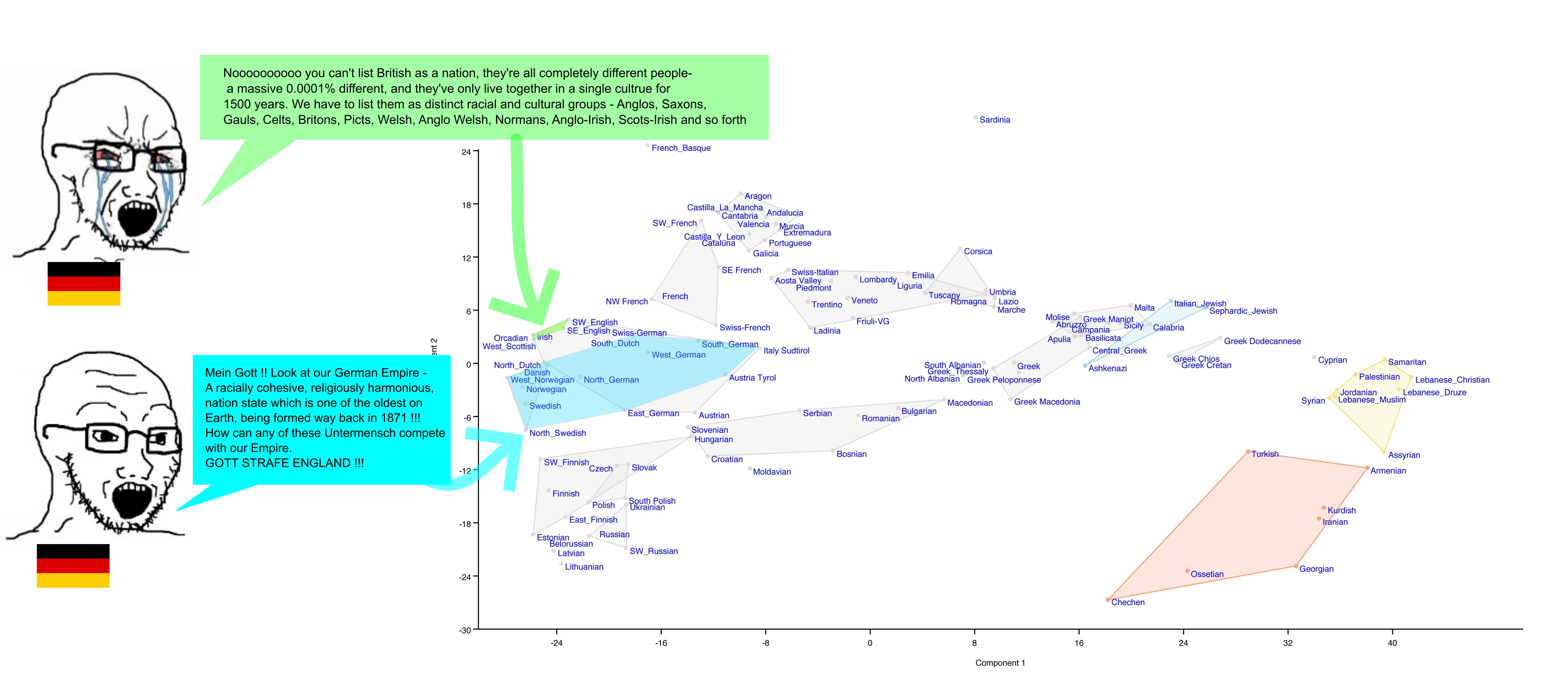 >>532388923Dunno why you posted this picture, I'm making the complete opposite point here. And yes, genetically, Germans are kind of euromutts, even the most diehard nordicist nazis acknowledged that, hence the concept of german "races" being a thing back then. Pretty much any central, western and northern European can be assimilated into the german people, arguably even a lot of easterners, and historically it has happened quite a lot. What separates Germans and Slovenians is culture and identity, which in this case is organic, but in regards to the British-Irish split kind of artificial. The Irish aren't English, but they are obviously a British people by both blood and culture. You've lived together much longer than you've lived apart, and have bled together as much as you have drawn each others' blood.