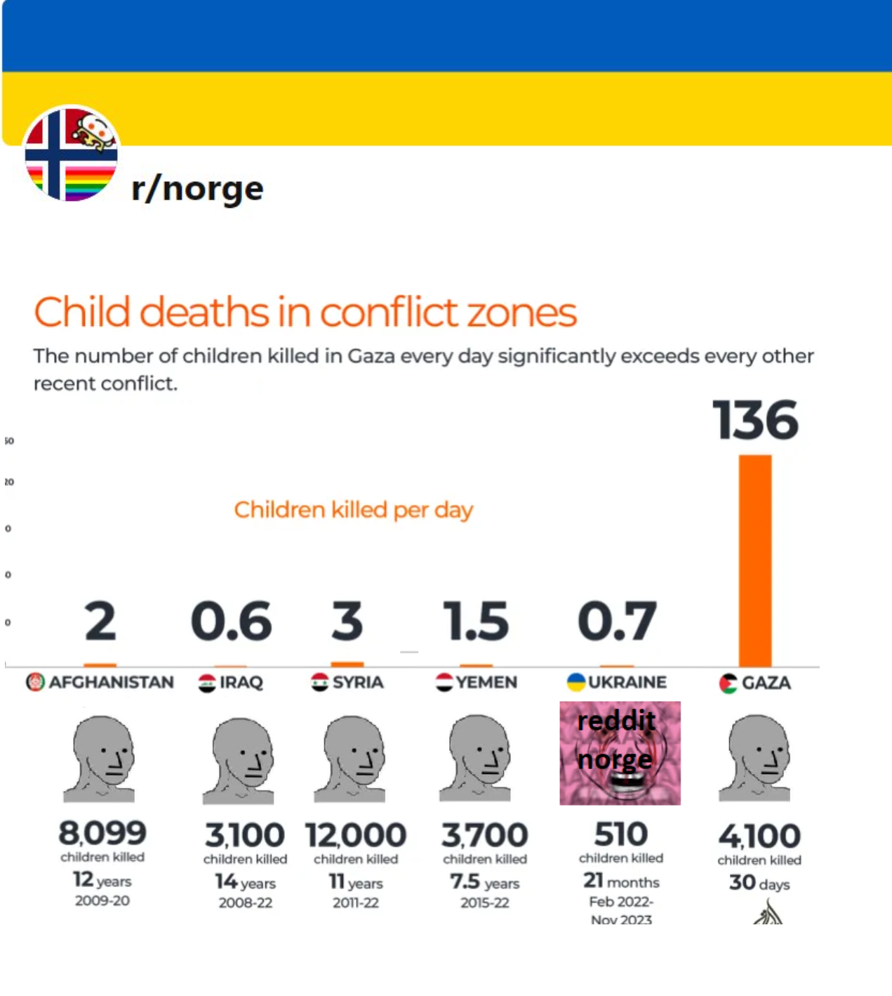 >>532363031Of the ones listed it's actually normal that only the lives of Ukrainian children matter as they are the only Europeans there.The rest are all some irrelevant sandnigger tribes.Every year close to 10 million brownoids all over the world starve to death, majority of them are children.And no one really cares about them dying because they're brown.