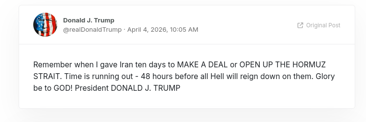 >>532362871>MAKE A DEAL or OPEN UP THE HORMUZ STRAIT>ori don't remember. his dementia is getting worse.