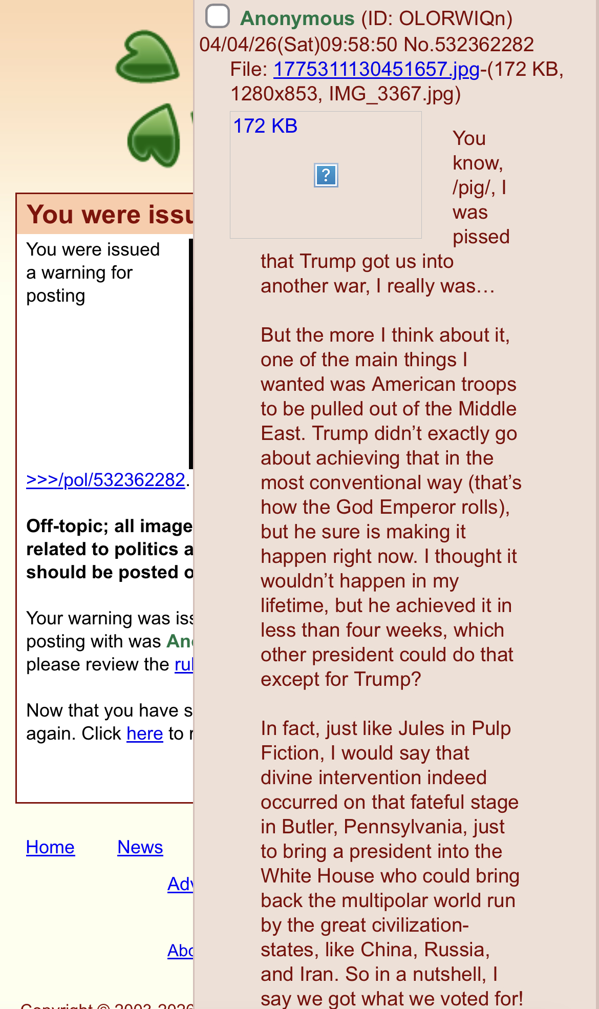 You know, /pig/, I was pissed that Trump got us into another war, I really was…But the more I think about it, one of the main things I wanted was American troops to be pulled out of the Middle East. Trump didn’t exactly go about achieving that in the most conventional way (that’s how the God Emperor rolls), but he sure is making it happen right now. I thought it wouldn’t happen in my lifetime, but he achieved it in less than four weeks, which other president could do that except for Trump?In fact, just like Jules in Pulp Fiction, I would say that divine intervention indeed occurred on that fateful stage in Butler, Pennsylvania, just to bring a president into the White House who could bring back the multipolar world run by the great civilization-states, like China, Russia, and Iran. So in a nutshell, I say we got what we voted for! :D