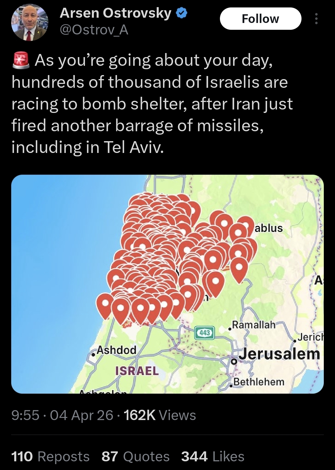 — Israel’s Channel 12: Debris from a cluster munition missile launched this morning from Iran fell near the Ministry of Defense site in Tel Aviv.