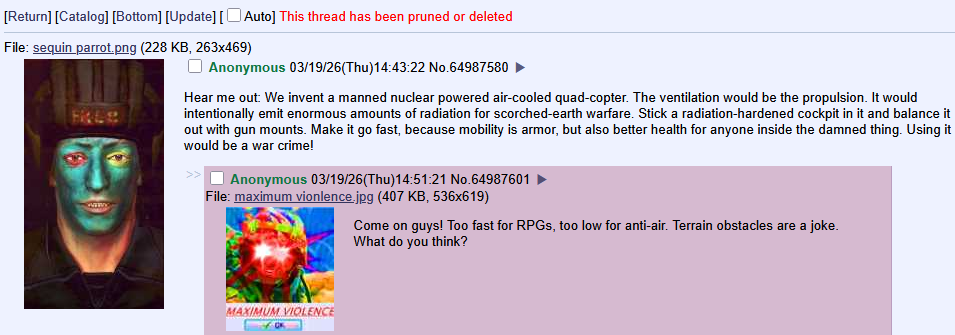 >>532364959I've seen the Ukranians countering jammers with fiber optic cables.I learned about the great unmanned weakness from Kerbal Space Program when my interplanetary unmanned missions went out of coms range (or I left the solar panels closed oopsie).There's interesting countermeasure possibilities against those fiber optic cables, like some great motherfucking slicer robot. Like a patrol drone that has fucking slicing sword wings. Fucking anime shit. The future of war here better be battle-bots. Leave the radiation anomalies to the spacers.Would you like to know about the artifacts? I touched an "air ball" once.
