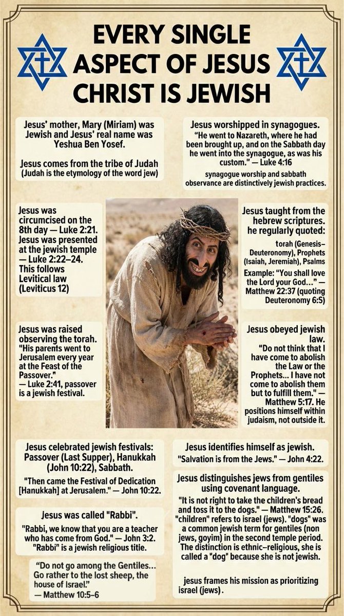 Can any of you refute the genealogy of Christdiscrepancy? Matthew's genealogy traces Jesus' lineage through Joseph backwards as follows: Joseph was the son of Jacob, the son of Matthan, the son of Eleazar, the son of Eliud, the son of Achim, the son of Zadok, the son of Azor, the son of Eliakim, the son of Abiud, the son of Zerubbabel, the son of Shealtiel, the son of Jeconiah, and continuing through earlier kings back through Solomon to David (and ultimately to Abraham).However, Jeremiah 22:30 states that none of Jeconiah's (also called Jehoiachin or Coniah) offspring shall succeed in sitting on the throne of David and ruling again in Judah—effectively barring his descendants from the throne. Then, Luke's genealogy (written later) provides an alternate lineage from Joseph backwards that omits Jeconiah entirely in that section: Jesus (as was supposed, the son of) Joseph, the son of Heli, the son of Matthat, the son of Levi, the son of Melchi, the son of Jannai, the son of Joseph, the son of Mattathias, the son of Amos, the son of Nahum, the son of Esli, the son of Naggai, the son of Maath, the son of Mattathias, the son of Semein, the son of Josech, the son of Joda, the son of Joanan, the son of Rhesa, the son of Zerubbabel, the son of Shealtiel, the son of Neri, and continuing through Nathan (another son of David) back to David (and ultimately all the way to Adam).Its likely the writer of Luke realized the earlier Gospel included this forbidden ancestor in the lineage and changed ir.....because its all fairy tales. Theres also this jewish gem:At a lodging place on the way, the LORD met him [Moses] and sought to put him to death. Then Zipporah took a flint and cut off her son’s foreskin and touched Moses’ feet with it and said, “Surely you are a bridegroom of blood to me!” So he let him alone. It was then that she said, “A bridegroom of blood,” because of the circumcision.Exodus 4:24Come home White manhttps://goyimtv.com/v/v24x4lnoqhh7by0a
