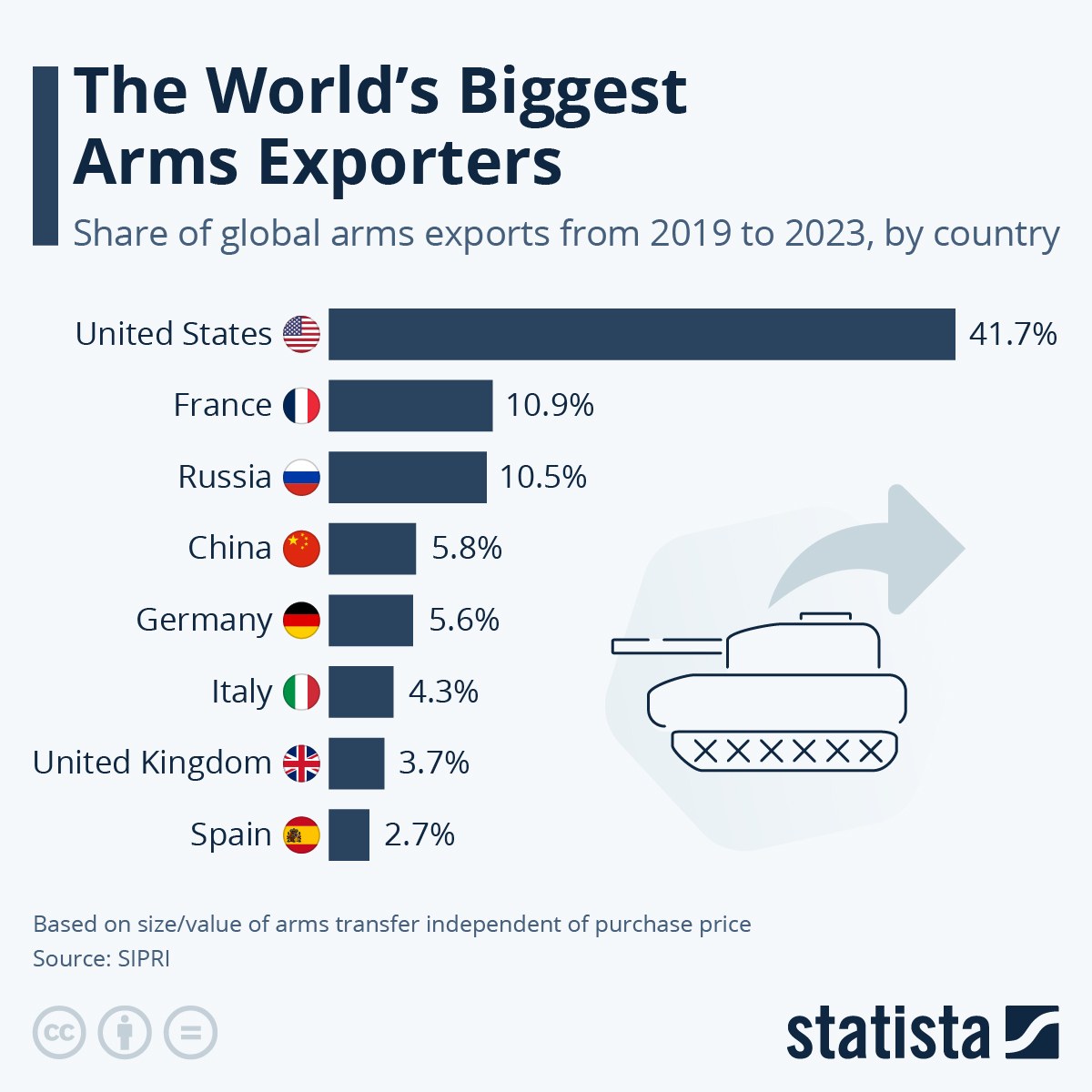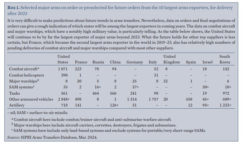 >>532385482Highly technological wares.You can't compare selling basic rockets, little firearms and modified common vehicles with advanced elctronic weapons.https://www.sipri.org/sites/default/files/2024-03/fs_2403_at_2023.pdf