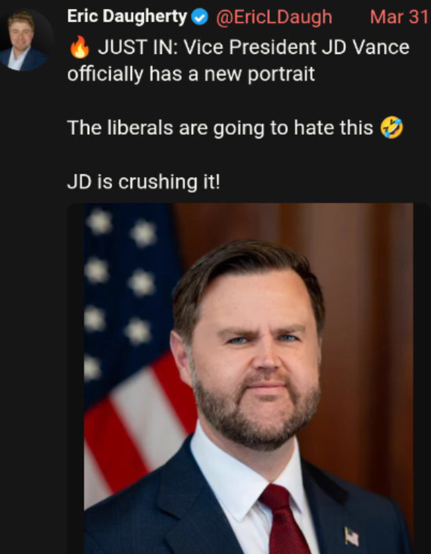 >>532377385Vance did just post a new portrait of himself, like they're grooming him for power. I can't recall any other president or vp taking a new portrait during their admin. Its just odd is all but everything about this whole admin is odd.