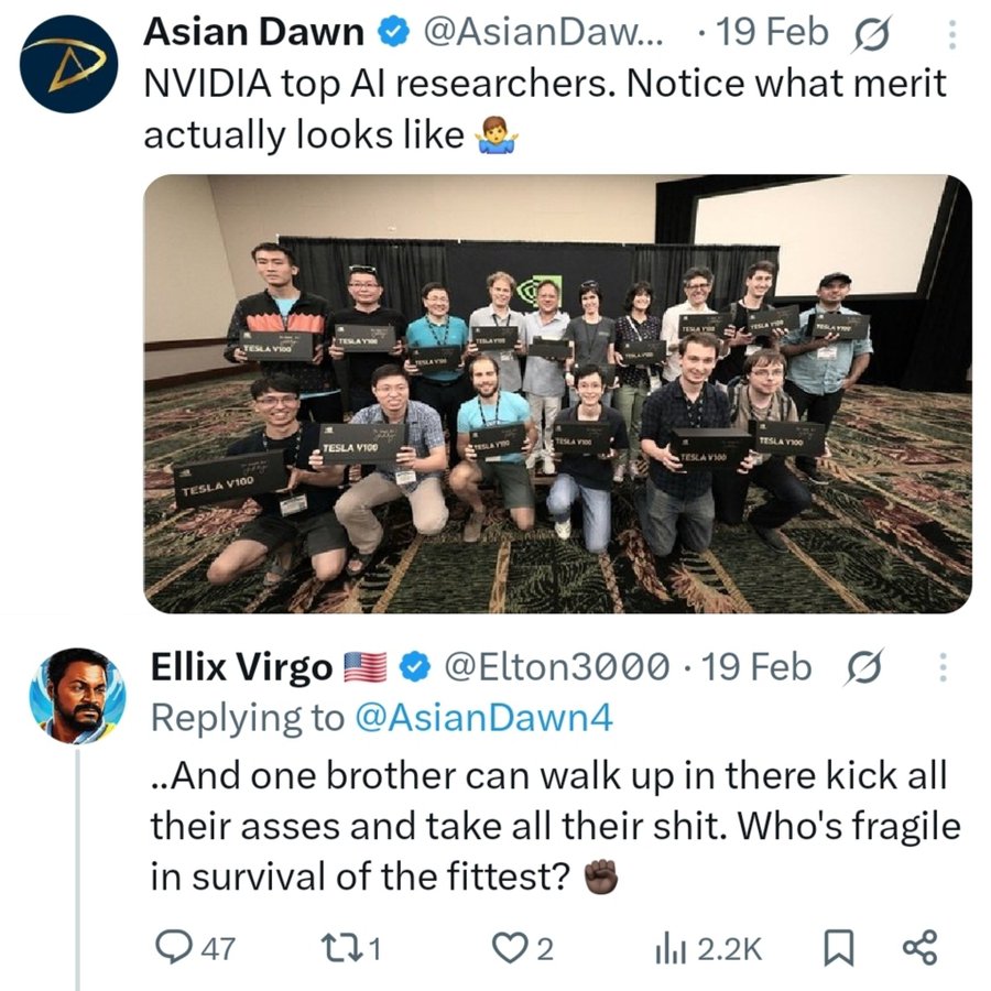 >>532387056There's some speculation about rice farming, but that doesn't really explain why SEAmonkeys are Latin American tier brainlets.I think the real answer is simply that whites got demoralized out of studying the math outside of a few countries like France, Poland (there are a disproportionate amount of Poles in frontier AI labs), and Russia, and simply find themselves unable to meaningfully contribute to pushing the frontiers of STEM research. It's not that whites can't. It's that modern whites are fundamentally uneducated barbarians by comparison.
